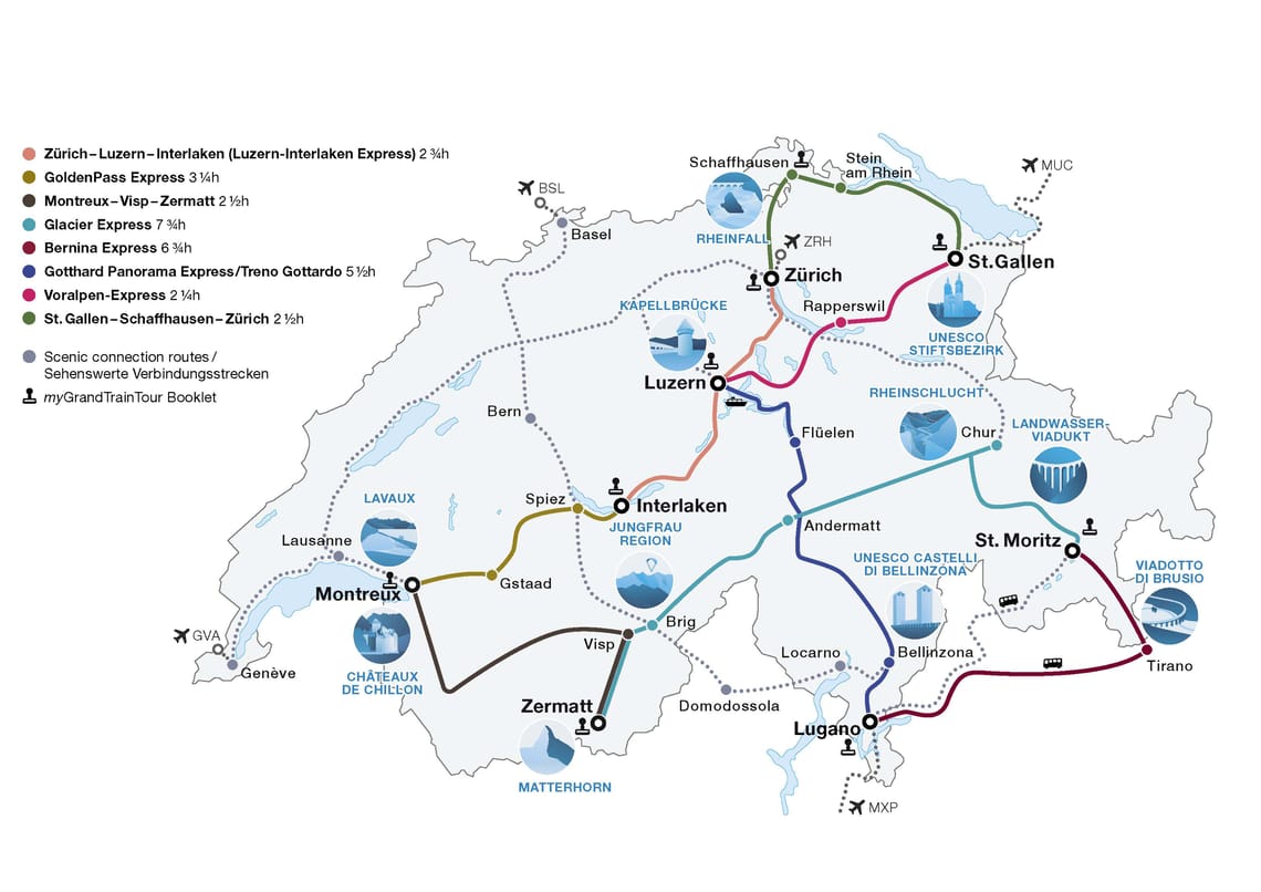 On 8 sections, the Grand Train Tour of Switzerland combines the most beautiful panoramic lines in a unique itinerary.