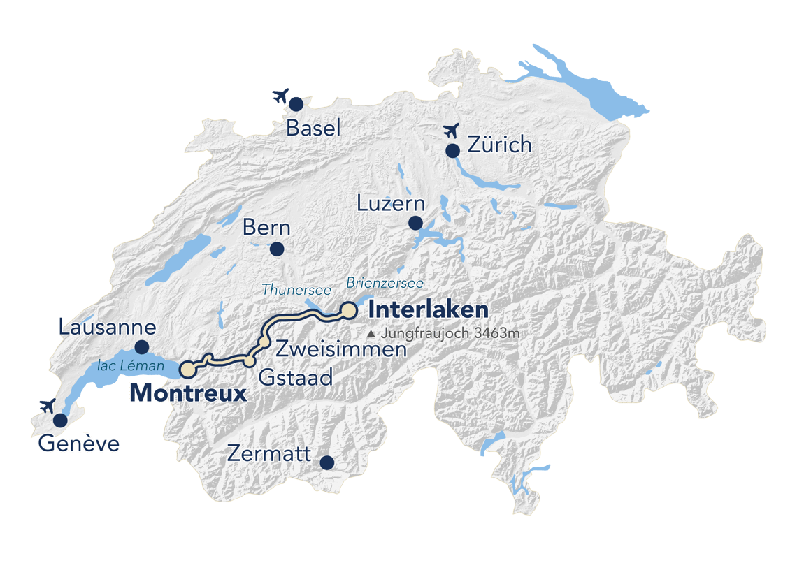 Eine seit über 100 Jahren erwartete Reise ohne Umsteigen zwischen Interlaken, Gstaad und Montreux. Eine einzigartige Technologie mit Drehgestellen mit variabler Spurweite. Ein moderner Zug mit drei Klassen (Prestige, 1. und 2. Klasse) und verschiedenen Serviceniveaus. Angebote für Gruppen, die je nach Bedarf angepasst werden können.