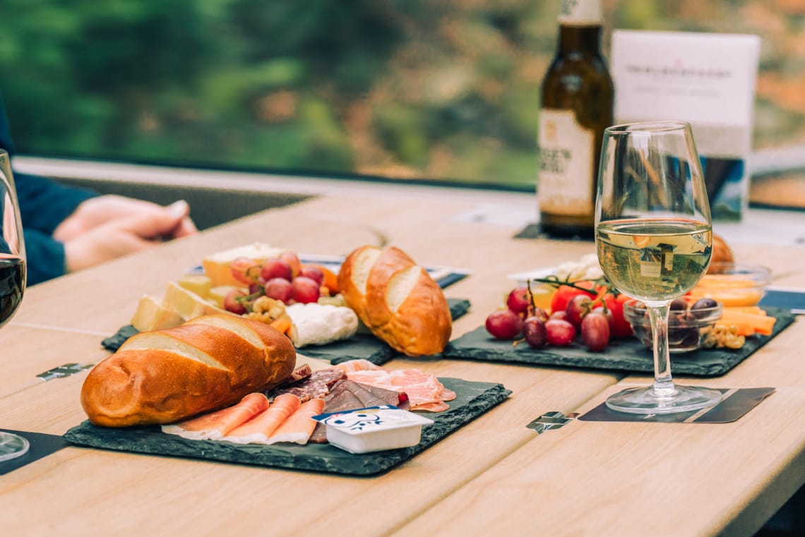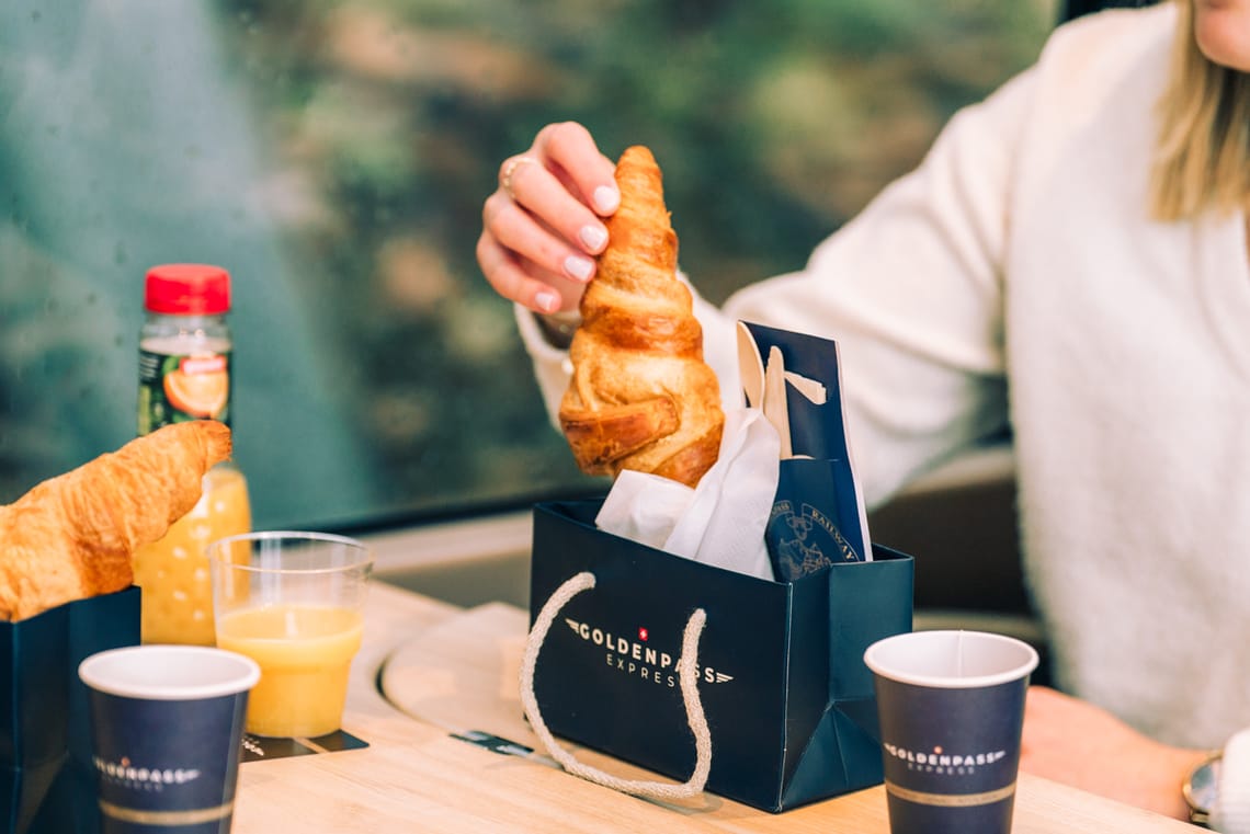 Suisse*, local et durable Le voyage ne se vit pas seulement avec les yeux mais aussi au travers des saveurs. À bord du GoldenPass Express, vous avez la possibilité de déguster de nombreux produits du terroir : du fromage local au caviar de Frutigen, des jus de fruits frais valaisans aux vins du Lavaux. Appréciez toute la variété de notre carte servie directement à votre place. Bon appétit!